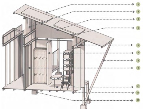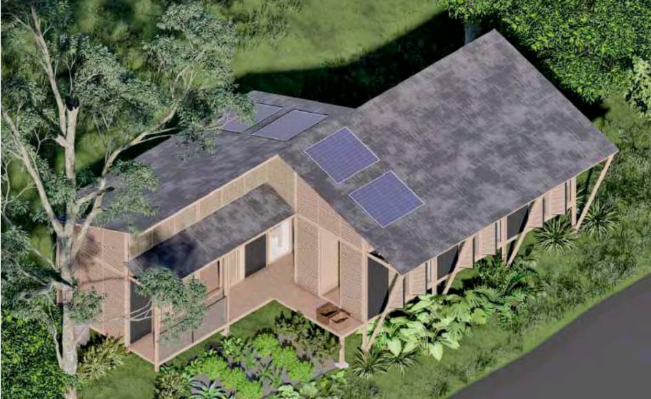 1. Cimentación con un sistema palafítico en dados de concreto y construcción de módulos en madera prefabricada que minimiza el uso de concreto y acero.